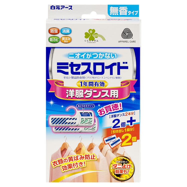 くらしリズム ミセスロイドは、衣類にニオイがつかない防虫成分を使用した1年間有効の衣類用防虫剤です。しかも防虫機能だけでなく、付加機能として消臭機能、防カビ機能、黄ばみ防止機能と収納空間のダニよけ効果がついています。